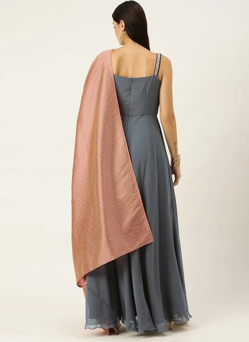 Teen Girls Grey Georgette Cowl Style Anarkali Suit Party Wear