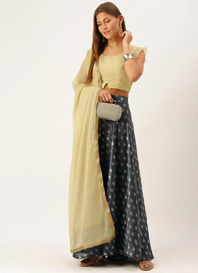 Teen Girls Grey N Beige Ruffled Arm Lehenga Set Festive Wear