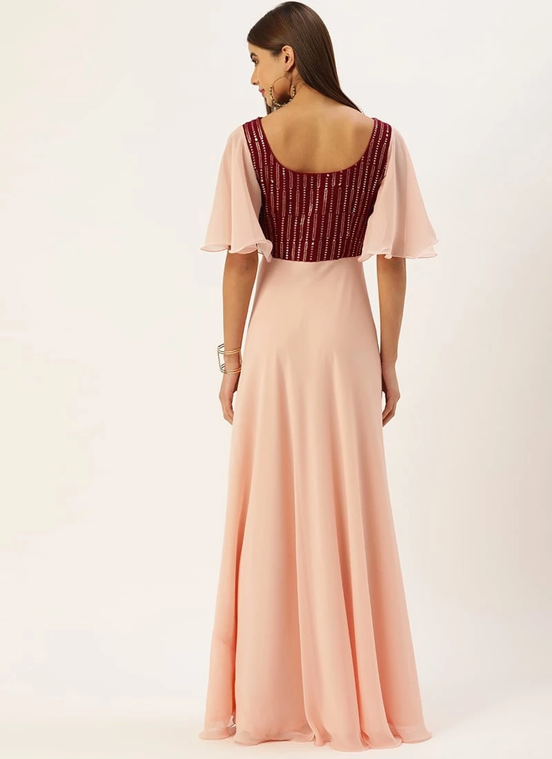 Teen Girls Maroon Embroidered N Pink Georgette Gown Party Wear