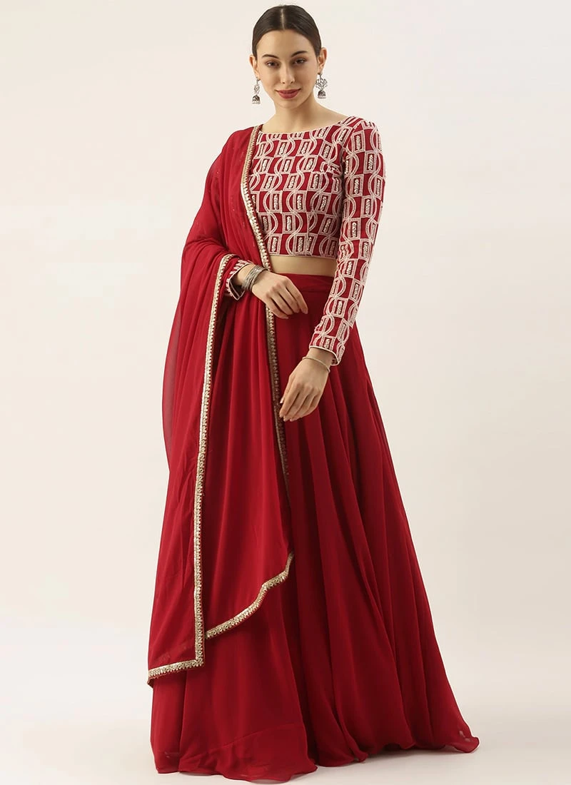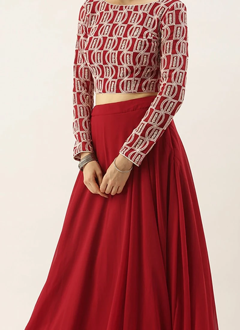 Teen Girls Maroon Georgette Embroidered Boat Neck Lehenga Festive Wear
