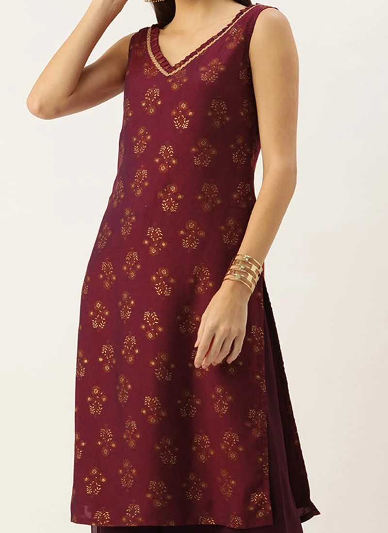 Teen Girls Maroon Rayon Printed V Neck Palazzo Suit Festive Wear