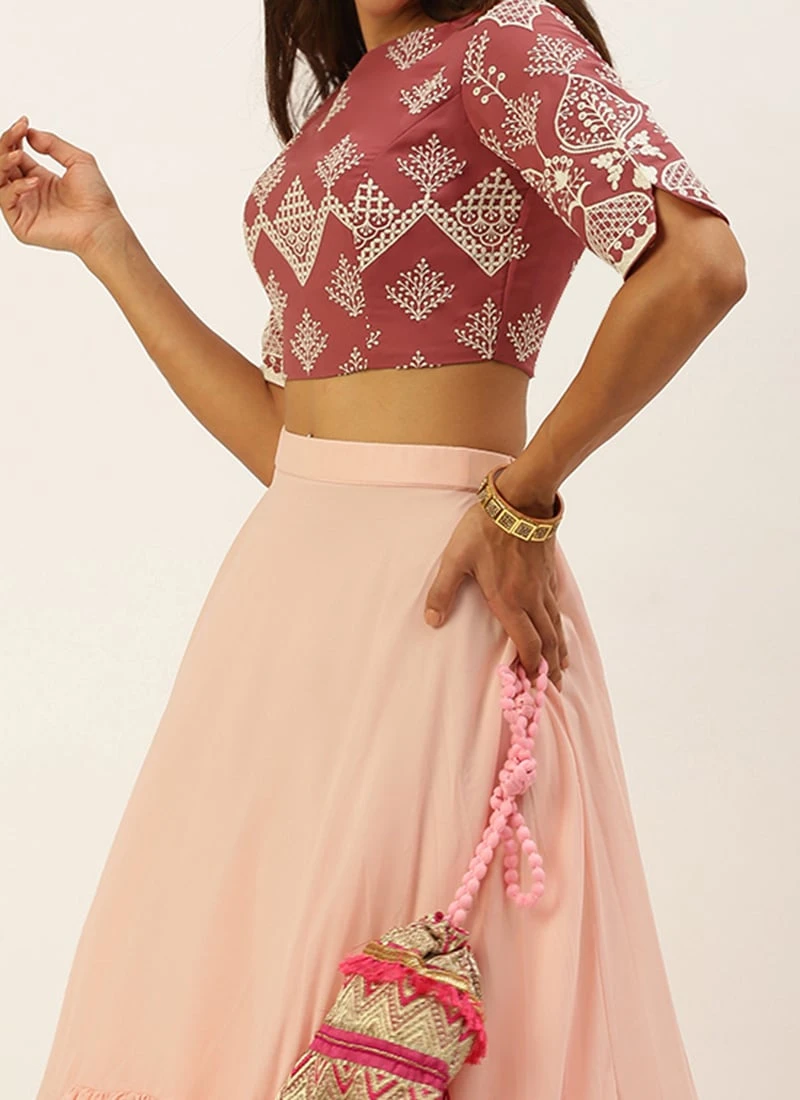 Teen Girls Mauve Embroidered N Peach Crop Top N Skirt Party Wear