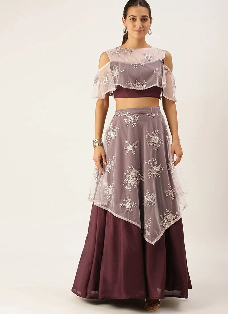 Presenting a purple muslin blouse feature with mauve embroidered net yoke and layer flare which attached from upper bust, blouse length natural waist, sleeveless and side zip closure and front and back neck is high neck, back has purple muslin non functional fabric button, paired up with purple muslin half circular flare skirt, waist type is band with elastic, it has mauve embroidered fabric asymmetrical layered, flare type handkerchief, highest length knee length and lowest length calf length.Mask only for shoot purpose.Refer the fabric image for true color of the dress. This dress is custom designed from fabric and custom stitched. Once sold cannot be returned.Designs, colors, and patterns on the actual product may slightly vary from designs shown in the image. Images are the only representative