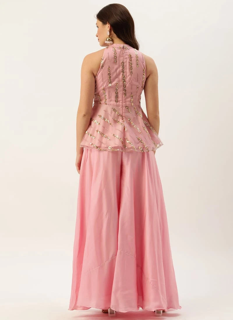 Teen Girls Mauve Net Sequins Peplum Top N Sharara Set Festive Wear