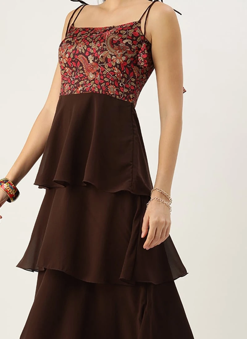 Teen Girls Multicolored Art Silk Printed N Brown Layered Dress Festive Wear