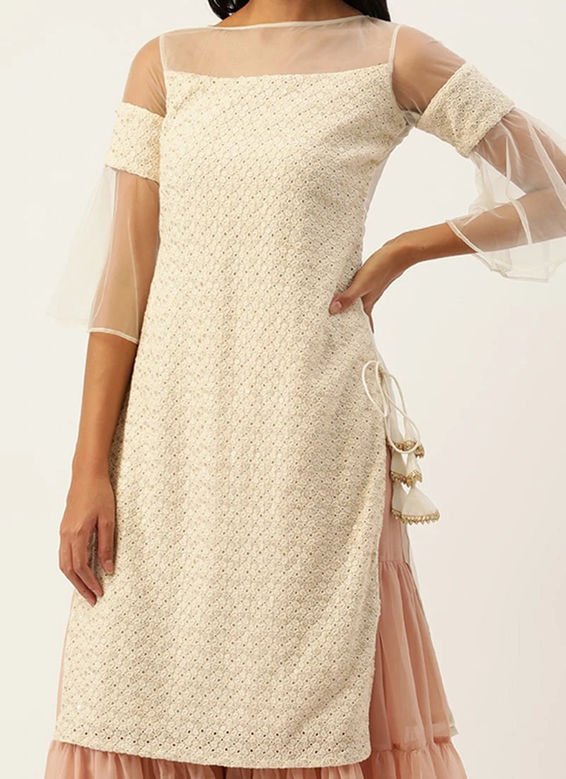 Teen Girls Off White Embroidered N Pink Layered Palazzo Suit Festive Wear