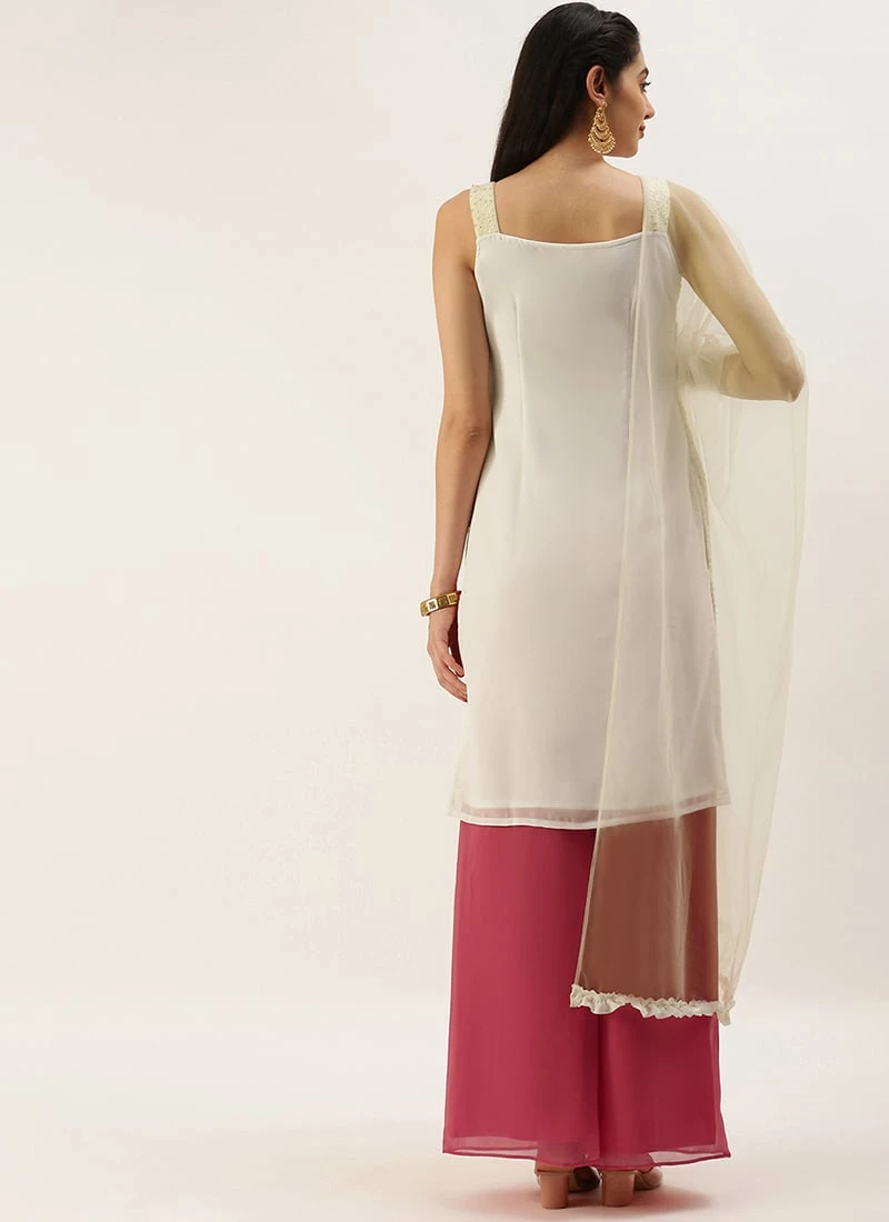 Teen Girls Off White Embroidered N Pink Palazzo Set Festive Wear