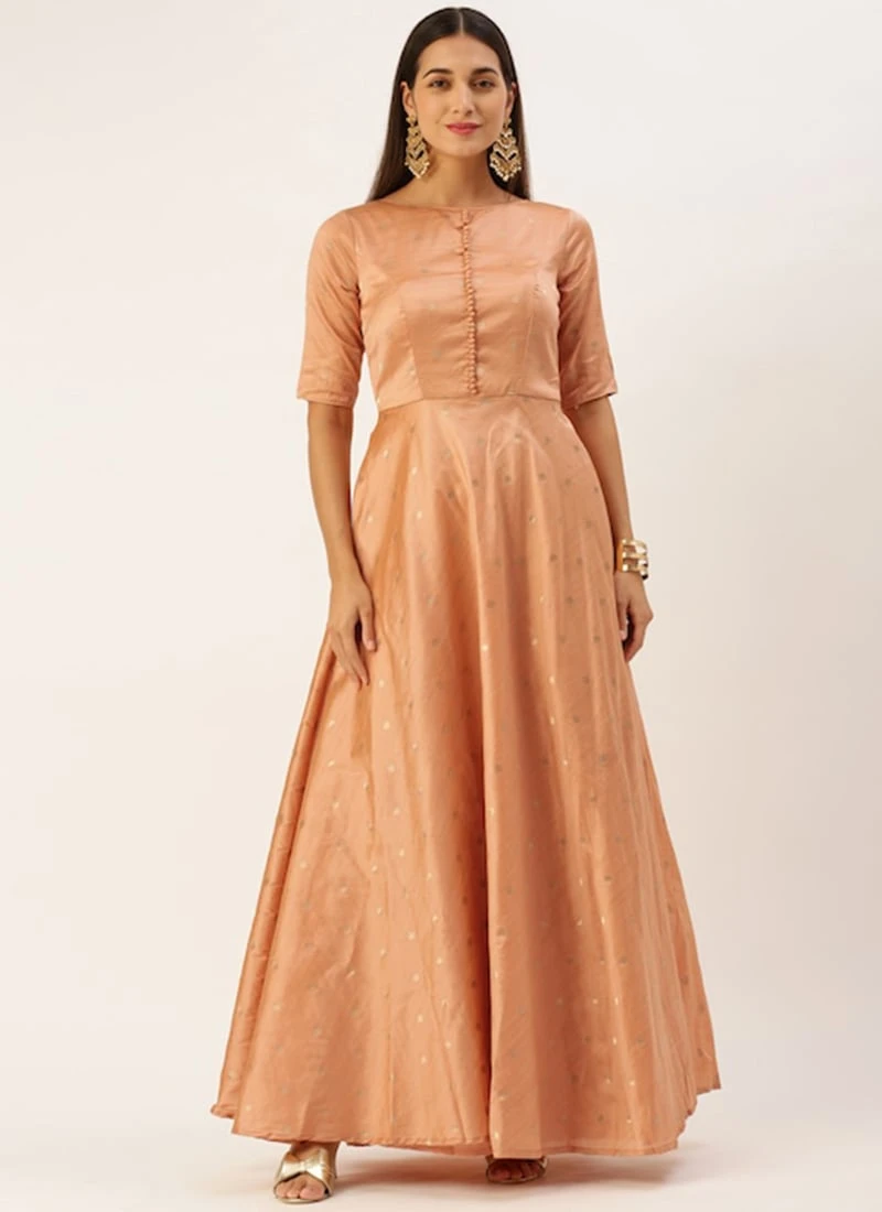 Teen Girls Peach Art Silk Jacquard Floor Length Gown Festive Wear