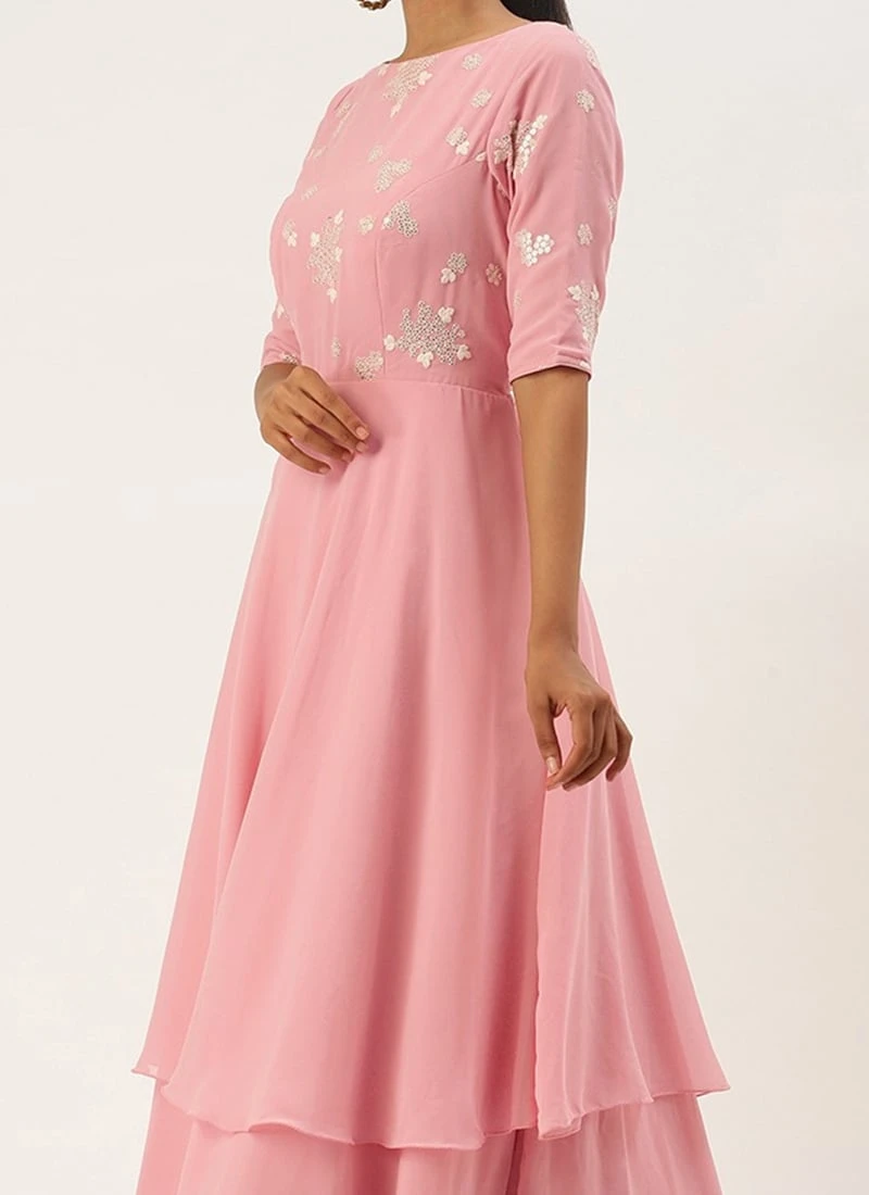 Teen Girls Pink Georgette Embroidered Layered Gown Festive Wear