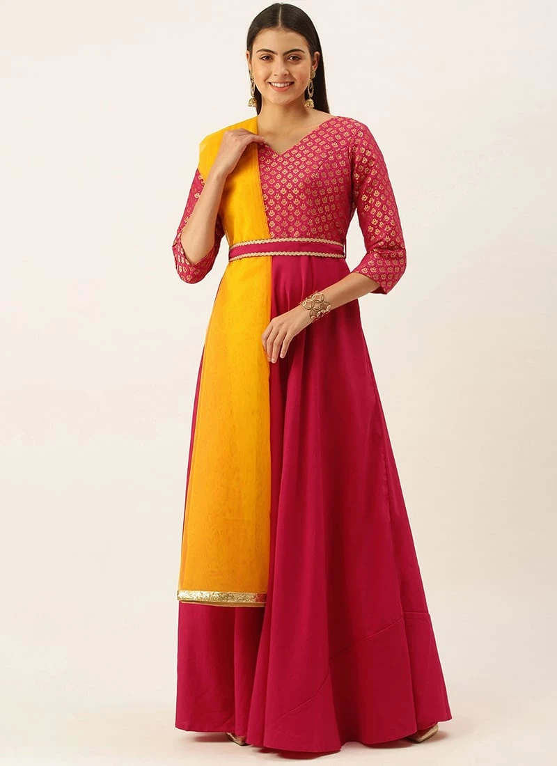 Teen Girls Pink Jacquard N Freesia Yellow Dupatta Style Gown Festive Wear