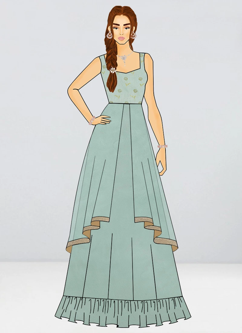 Presenting a layered style gown, features sea blue cotton yoke with the diamond neck in the front, square neck in the back, yoke until natural waist-length, has a beautiful mint green high an low full circulate net flare starting from knee to calf with trim detailing, followed by a full circular floor length flare along with gathered edges. It has side zip closure.Mask only for shoot purpose.Refer the fabric image for true color of the dress. This dress is custom designed from fabric and custom stitched. Once sold cannot be returned.Designs, colors, and patterns on the actual product may slightly vary from designs shown in the image. Images are the only representative