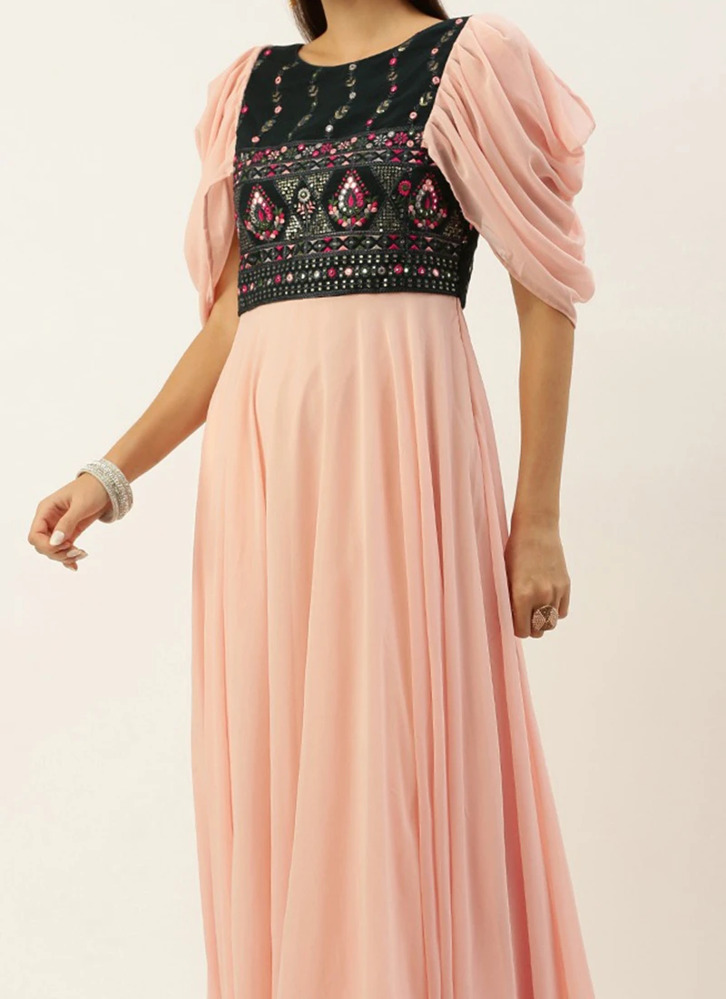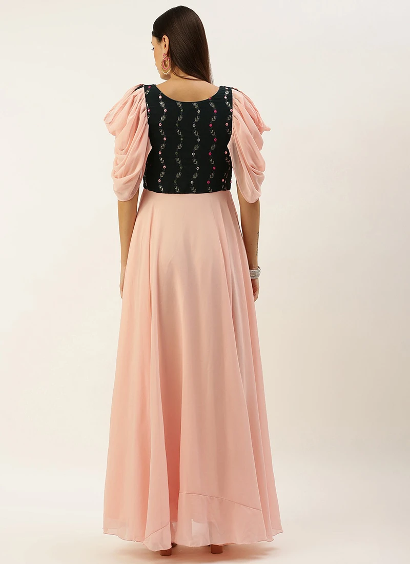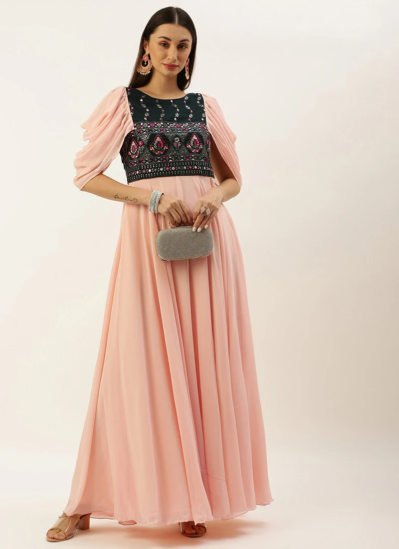 Teen Girls Teal Green Embroidered Round Neck Gown Festive Wear