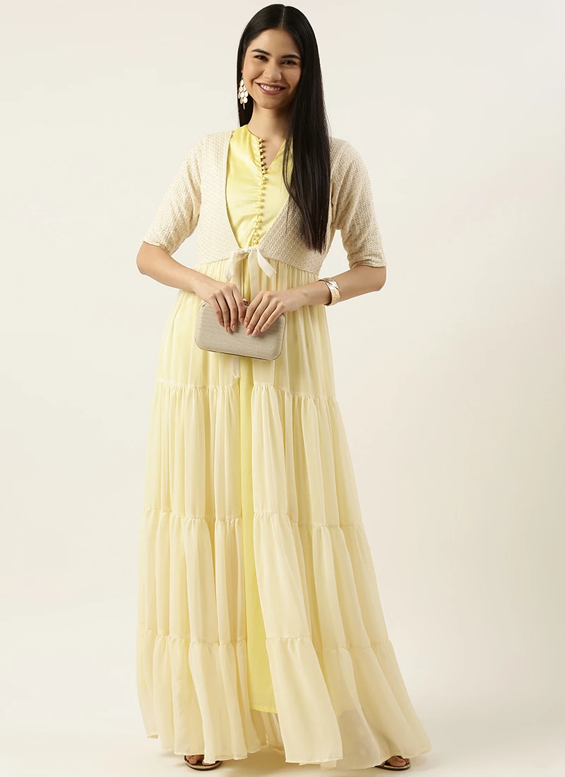 Teen Girls White Embroidery Jacket N Yellow Taffeta Dress Festive Wear