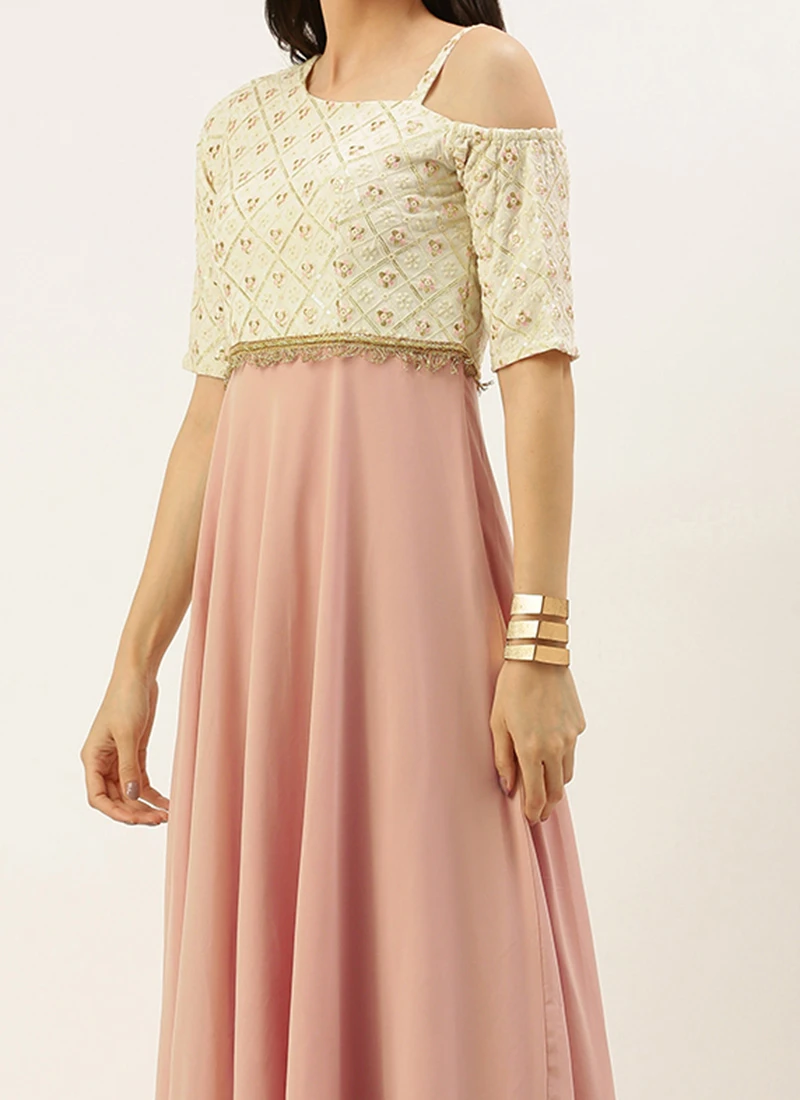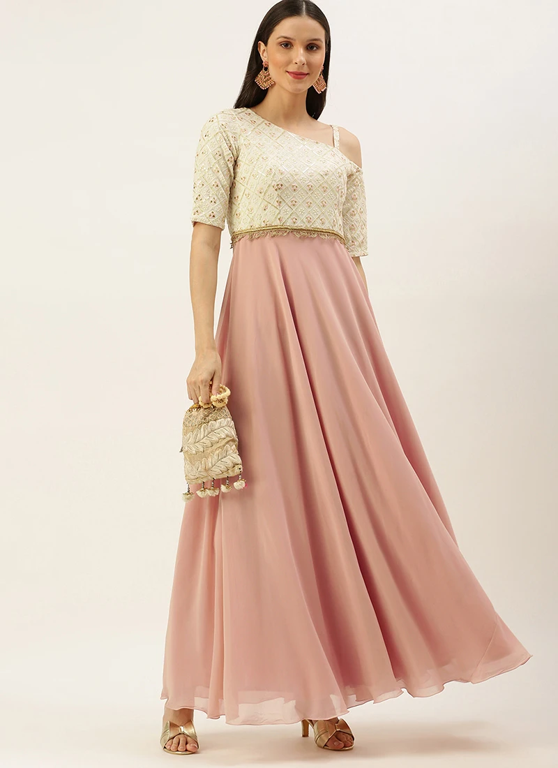 Teen Girls White N Pink Embroidered One Shoulder Gown Party Wear