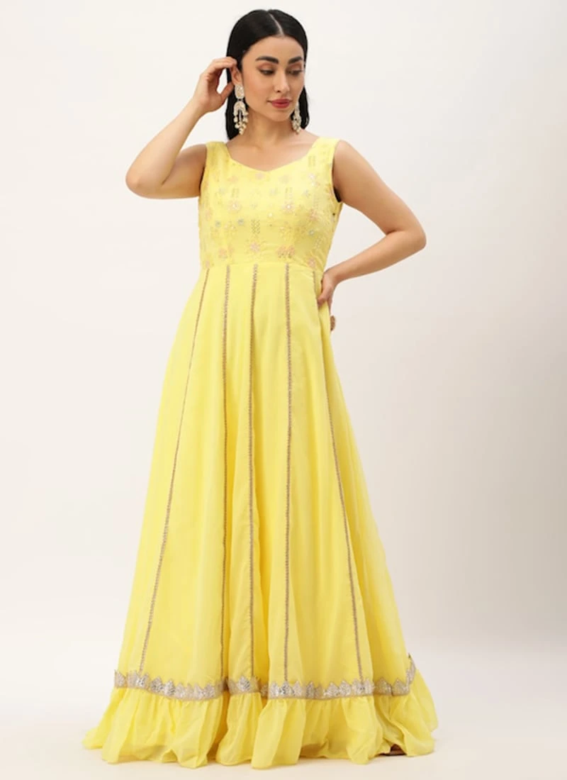 Teen Girls Yellow Embroidered Georgette Kali Gown Festive Wear