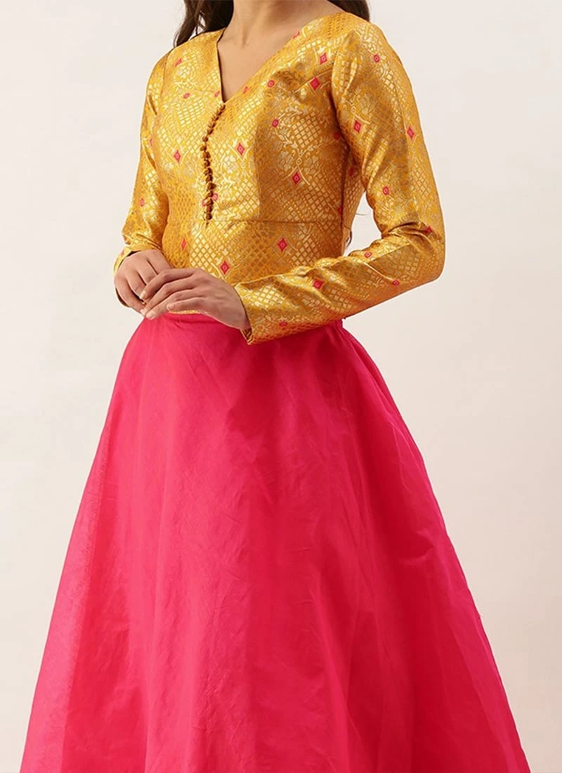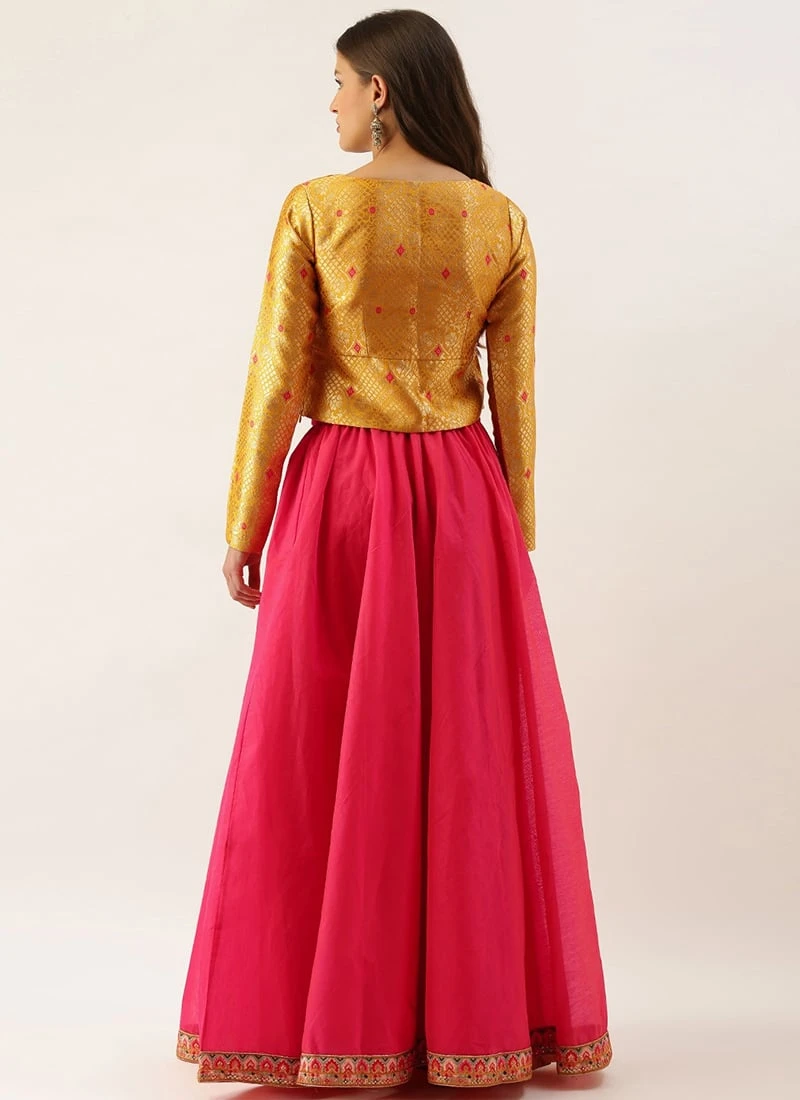 Teen Girls Yellow Peplum Top With Pink Chanderi Skirt Set Party Wear