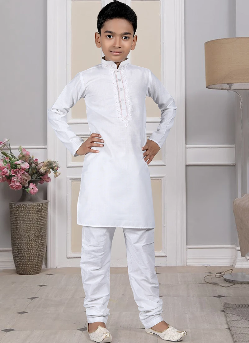 Outstanding craftmanship of exhibited in this white color cotton kids boys kurta pyjama enriched with embroidered work and crafted with full sleeves and mandarin collar neckstyle is representing a royalty in itself. This Kurta pyjama comes with cream art silk chudi pant bottom.