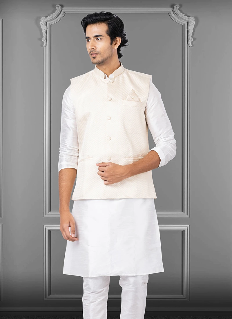 You will be confident to make a impressive fashion statement with this white diamond silk nehru jacket crafted with mandarin collar neck and sleeveless enriched with soild plain work is representing royalty in itself.