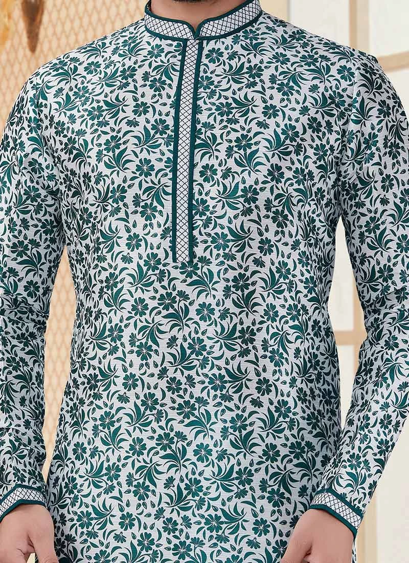 White N Green Silk Digital Printed Kurta Pyjama Party Wear