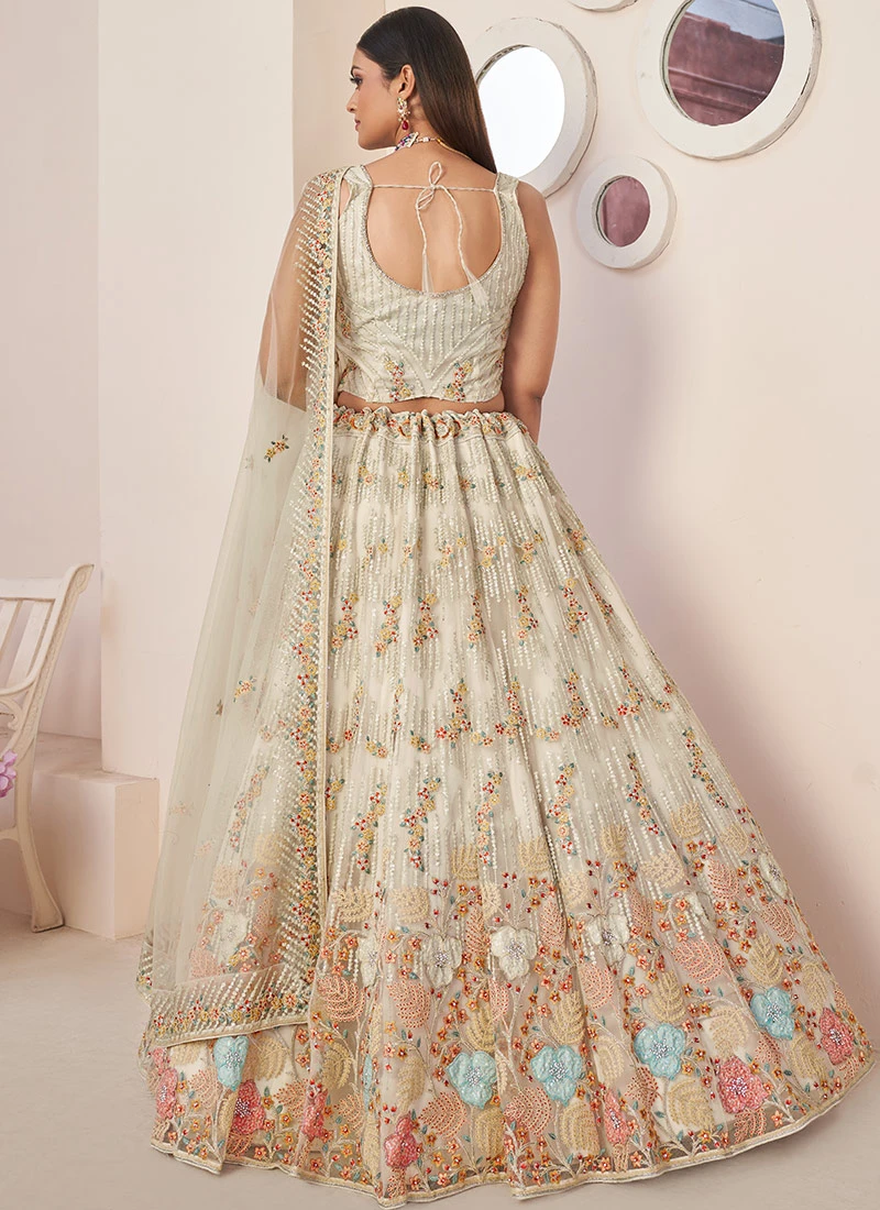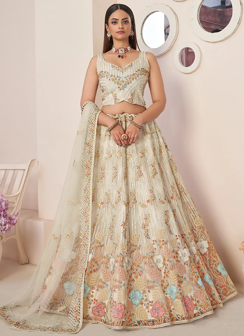 The lehenga skirt made from highquality net fabric drapes gracefully and accentuates the feminine silhouette. Its pristine white color symbolizes purity and grace making it a popular choice for weddings receptions and other grand celebrations. The umbrella cut adds a touch of regality to the outfit giving it a royal appeal.