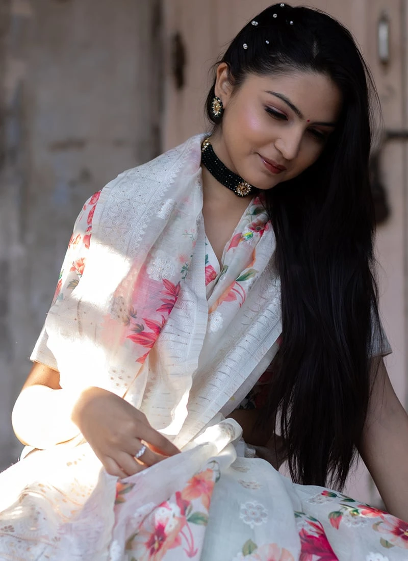 White Soft Silk Printed Work Saree After Six Wear