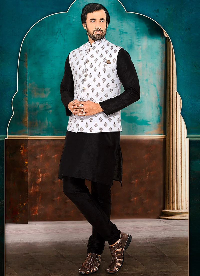 An remarkable white terry rayon nehru jacket crafted with mandarin collar neck and sleeveless enriched with printed work is representing royalty in itself.