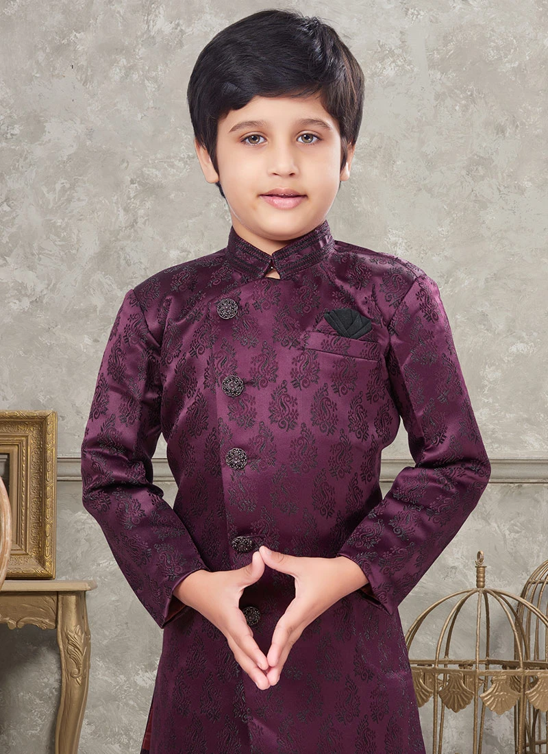In summary the Wine Art Silk Jacquard Indowestern Sherwani is a masterpiece of Indian fashion blending opulent design with cultural significance. Its rich wine colour art silk jacquard fabric and intricate embellishments make it a showstopper for any special occasion allowing you to make a lasting impression with your style and sophistication.