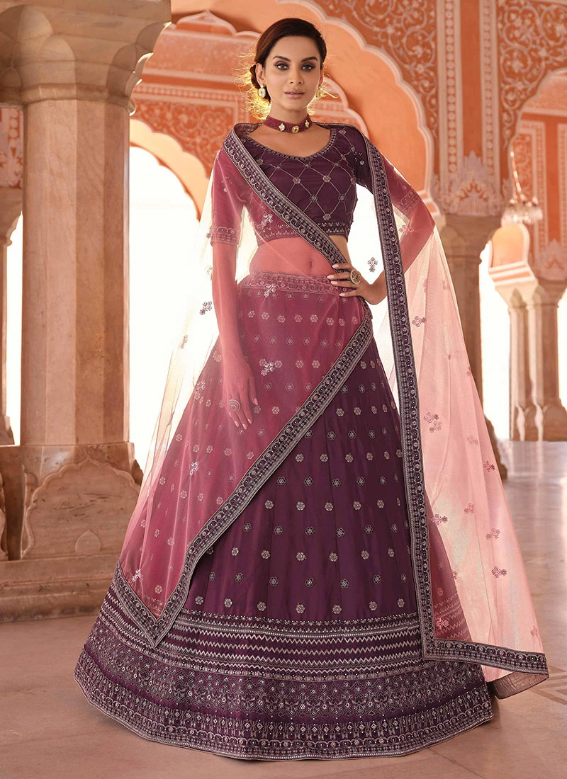Wine Crepe Embroidered N Stones Umbrella Lehenga Wedding Wear