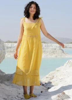 Yellow Glitter Foil Tiered Gathers Dress Party Wear
