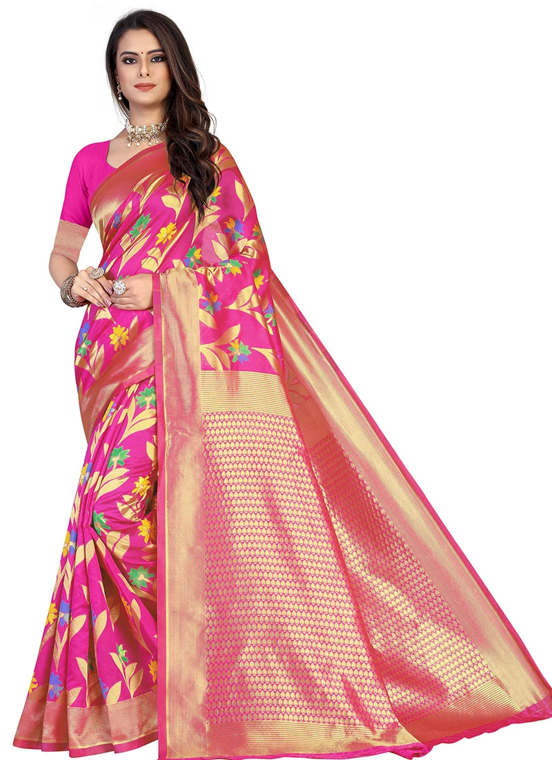Woven Work Rani Pink Color Cotton Saree Festive Wear