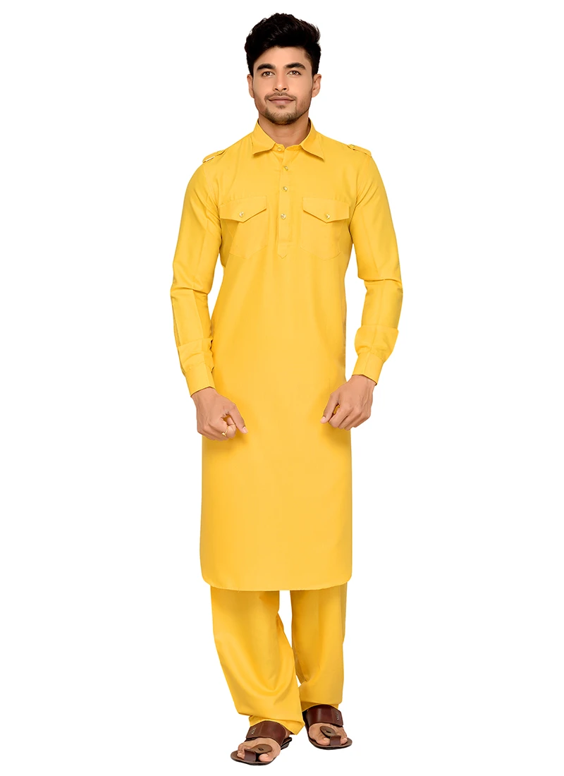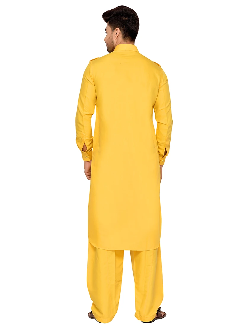 Yellow art silk plain structred pathani set with side square pockets on it. Comes with matching bottom.