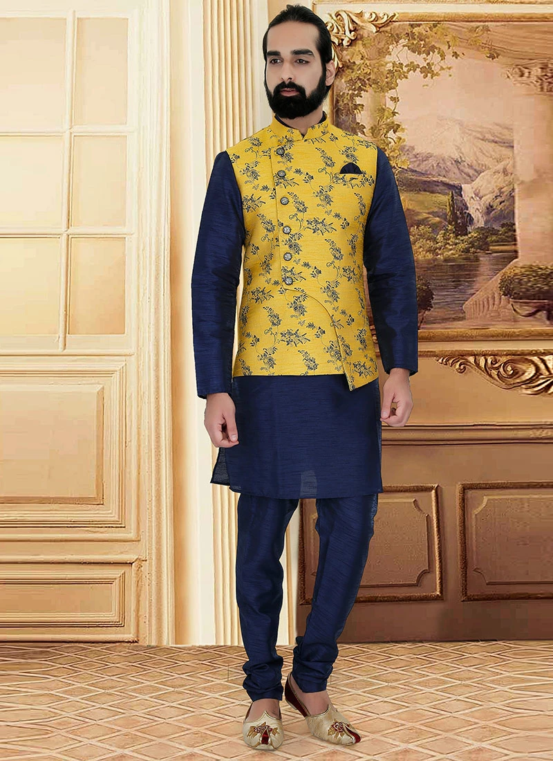 An superb yellow brocade nehru jacket crafted with mandarin collar neck and sleeveless enriched with printed work is representing royalty in itself.