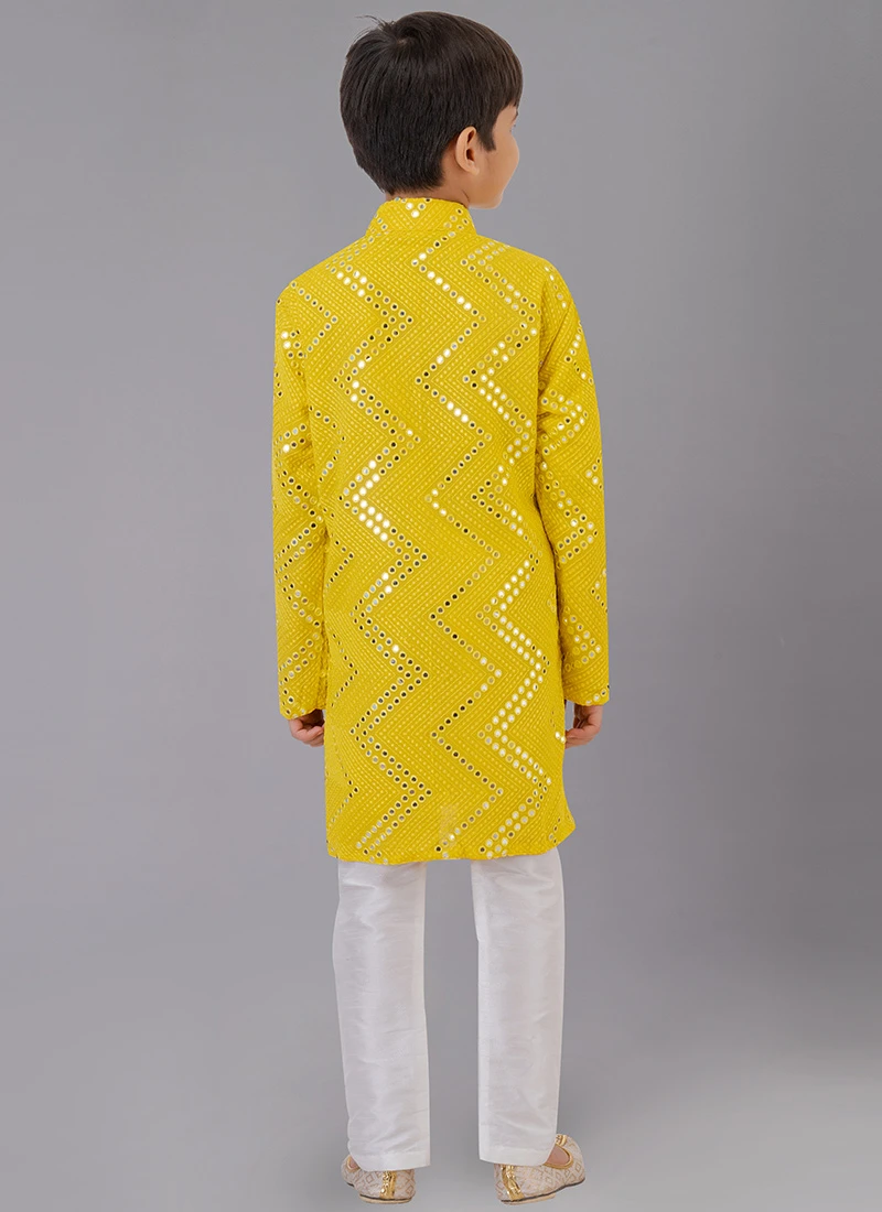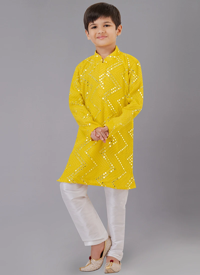 Style and trend will be at the peak with this yellow color georgette kids boys kurta pyjama enriched with embroidered work and crafted with collar neck and full sleeves is representing a royalty in itself. This kurta pyjama comes with white banarasi dupion silk chudi pant bottom.