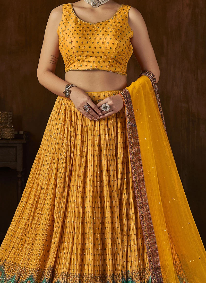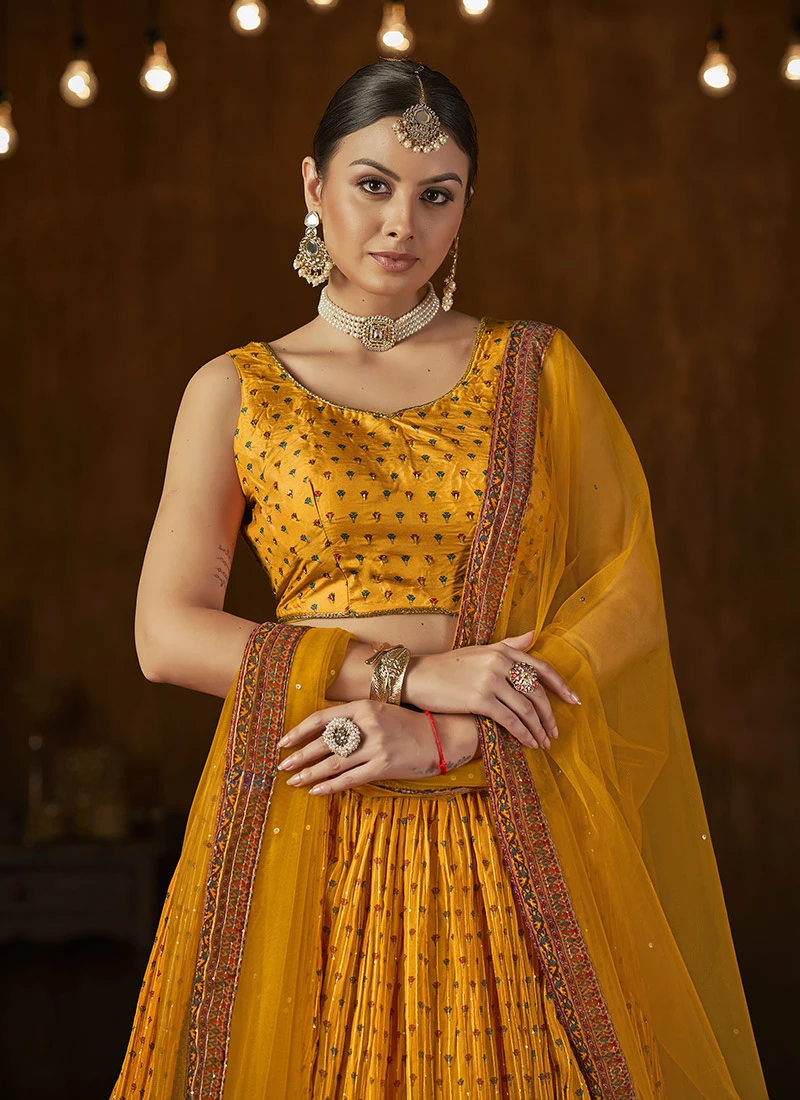 Comes with semi -stitched lehenga, un stitched choli and dupatta fabric. To have it stitched, please select the custom tailoring options. Lehenga with elaborate patterns and colors are used for photo-shoot. Color and pattern of the lehenga might not be as shown in the image.