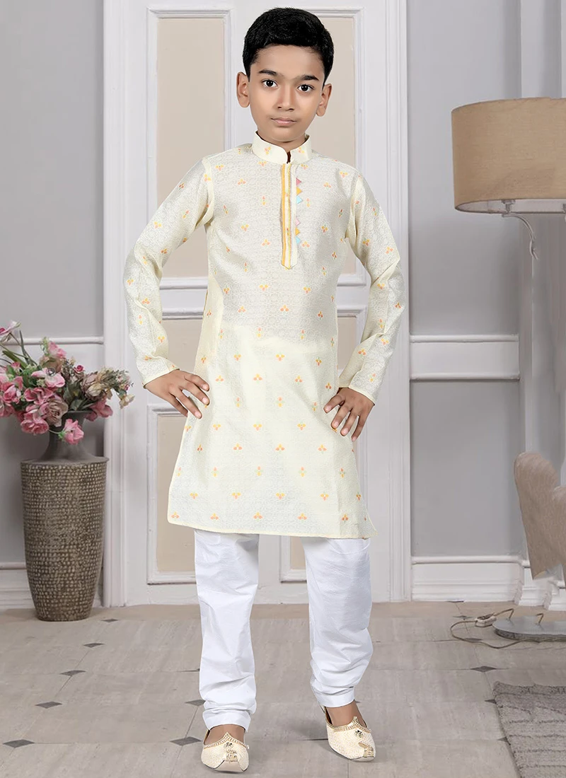 Shine brighter as you wear this yellow color silk kids boys kurta pyjama enriched with embroidered work over the kurta and crafted with mandarin collar neck and full sleeves looks chic and great. This kurta pyjama comes with cream color art silk chudi pant bottom.