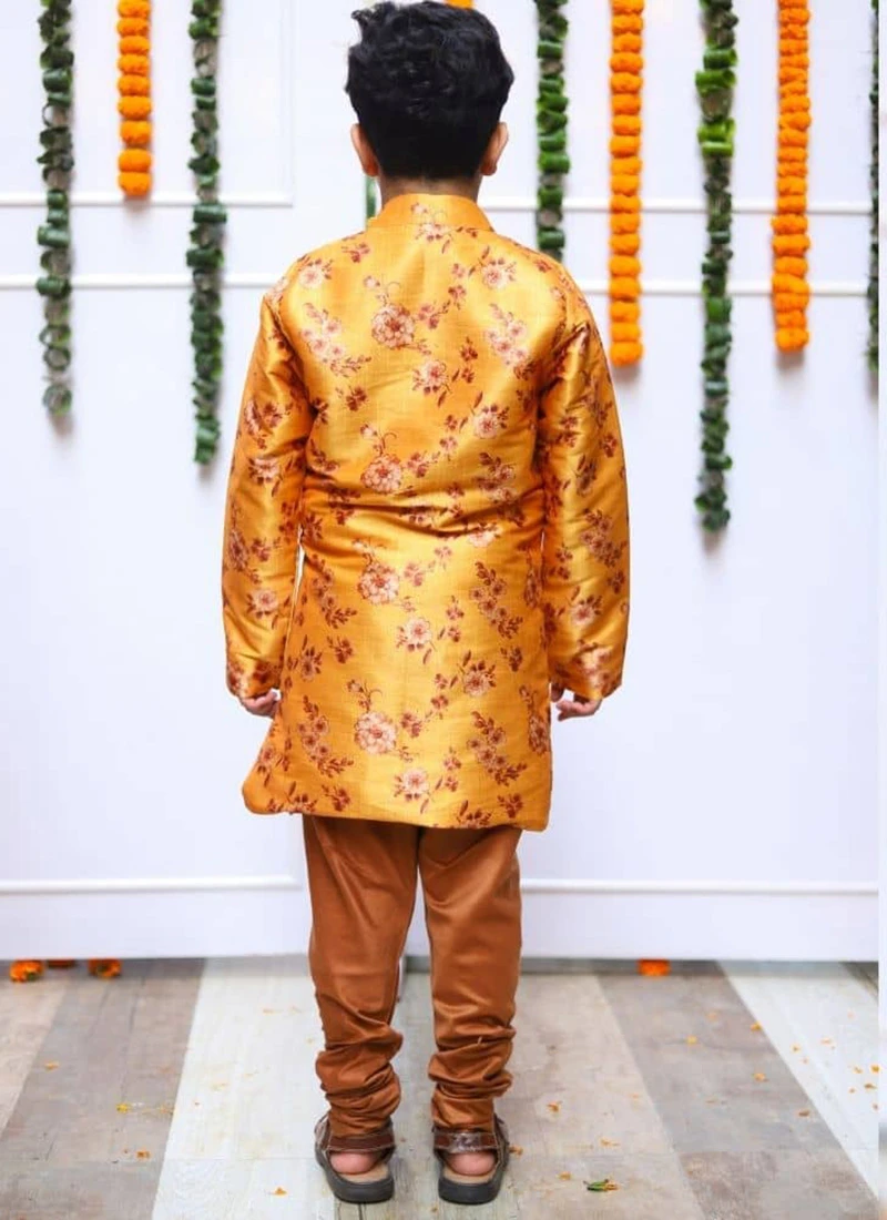 Yellow Silk Printed Kids Boys Classic Sherwani Party Wear