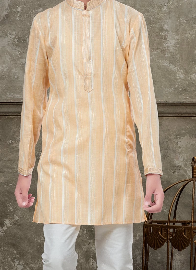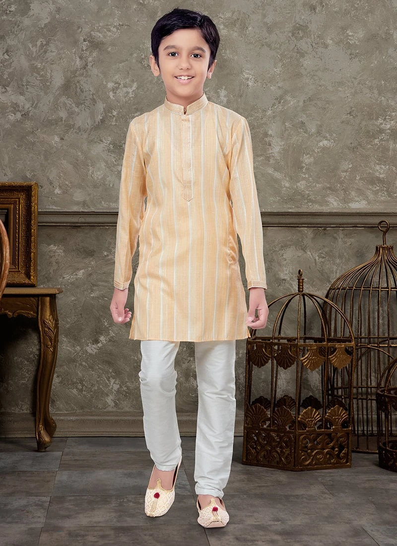 In summary the Yellow to OffWhite Blended Cotton Kids Boys Kurta Pyjama is a perfect blend of style comfort and tradition for young boys. Its cheerful colours highquality fabric and intricate detailing make it an ideal choice for celebrating special moments and cultural festivities. Your child will not only look adorable but also feel at ease while wearing this charming outfit.
