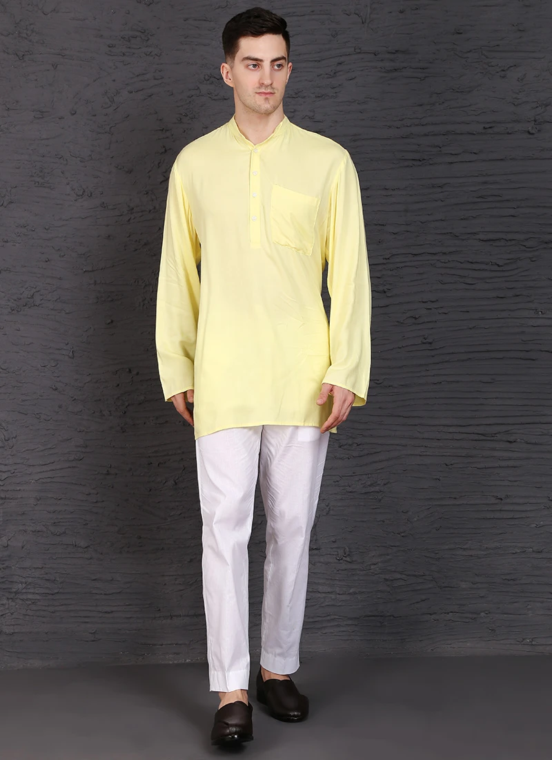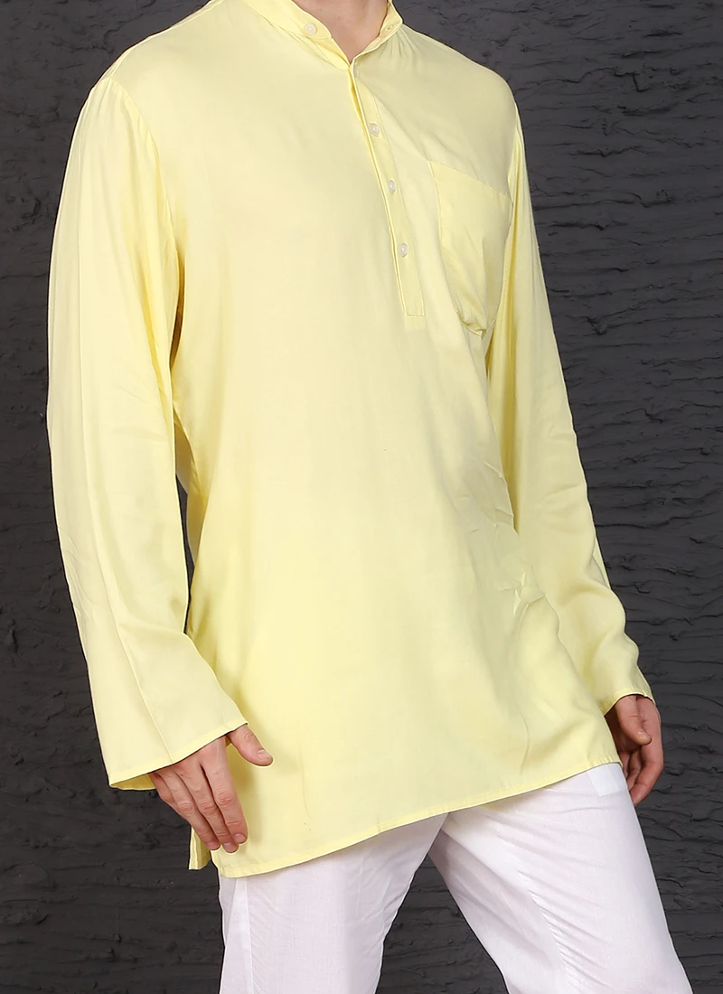 Spruce up your style in this yellow viscose cotton kurta. Elegance is emitted by the self colored patterns ornamented with plain work on attire.